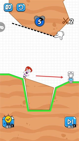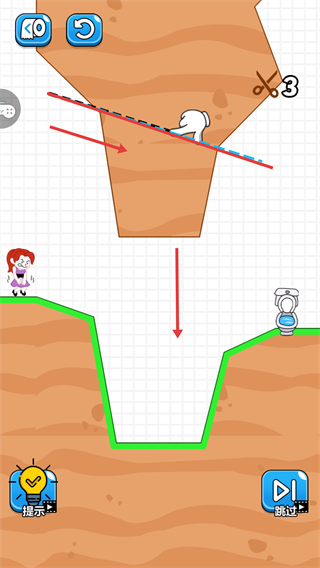 2、在关卡中,使用剩余次数【3】的剪刀道具,按照指引剪断指定的线,使地形变化,助力角色向【马桶】方向移动。
