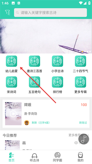 1、进入首页后点击【幼儿启蒙】模块,可选择适合低龄儿童的古诗内容,开启启蒙学习之旅。
