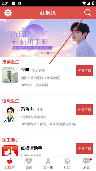 1、主界面有推荐医生列表,点击【免费咨询】可与【李明】等医生在线沟通,快速获取HIV诊疗专业建议。