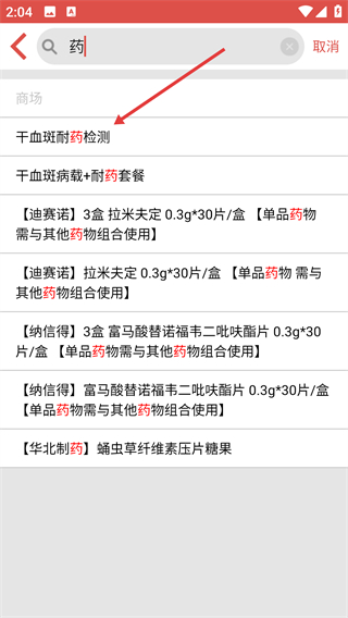 2、在搜索框输入【药】字,触发药品相关内容搜索,可找到所需药物信息及检测服务,方便后续操作。
