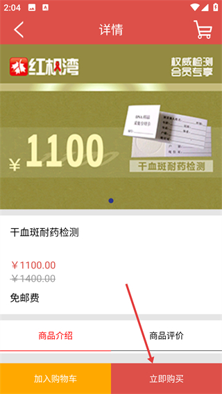 4、进入【干血斑耐药检测】详情页,查看价格为【¥1100】,点击【立即购买】完成检测服务选购。