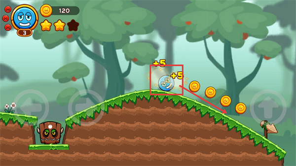 3、移动过程中触碰增益效果可获得【+5】的数值加成,同时继续收集沿途金币,提升得分至【120】。