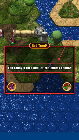 1、控制蓝军士兵时点击单位会出现绿色移动箭头,箭头覆盖区域内规划移动路线,全部行动后点击红色按钮结束回合。