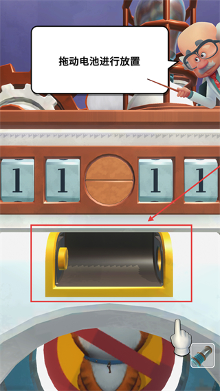 4、将拿到的【电池】拖动到指定放置槽,为时间机器充能,解锁下一步寻找小猫的路径。