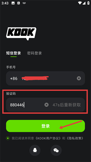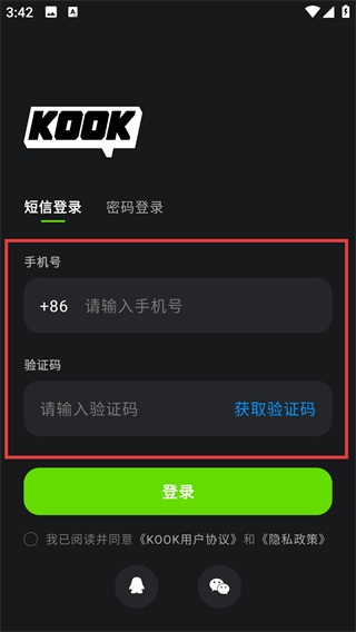 1、在【KOOK】短信登录界面,找到【手机号】输入框填写号码,准备进行后续的验证码获取操作。