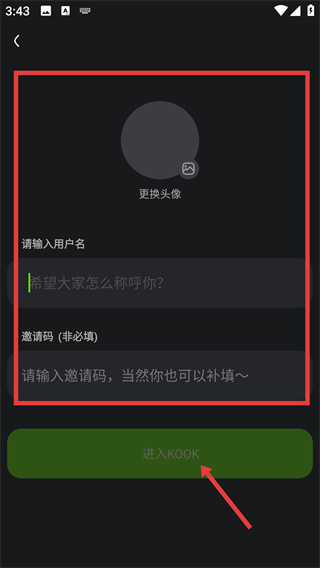 4、登录后进入完善信息页,填写【用户名】,邀请码非必填,完成后点击【进入KOOK】按钮进入应用。