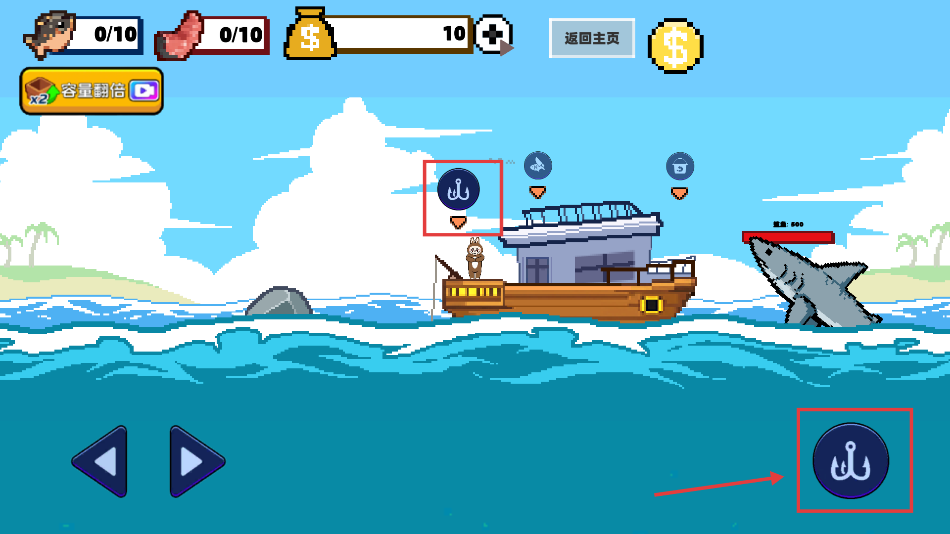 1、移动到钓鱼区域点击右侧下钩按钮,让鱼钩下放至海底,等待捕获各类鱼类的时机。
