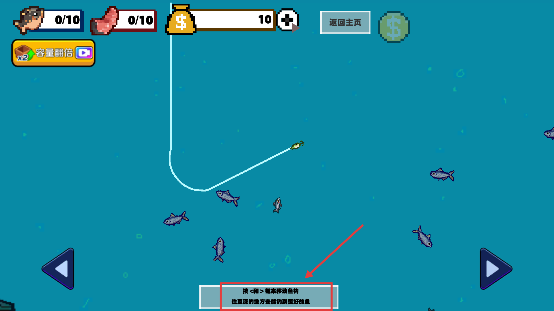 3、按左右键移动鱼钩,探索更深水域,提升钓到优质鱼的几率,加快金币积累速度。