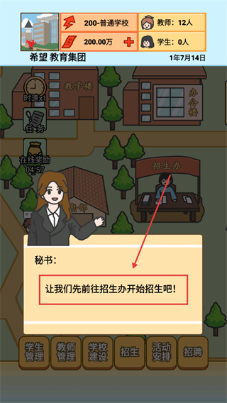2、根据秘书提示前往【招生办】,开启学校招生流程,为后续招收学生奠定基础,推进学校发展。