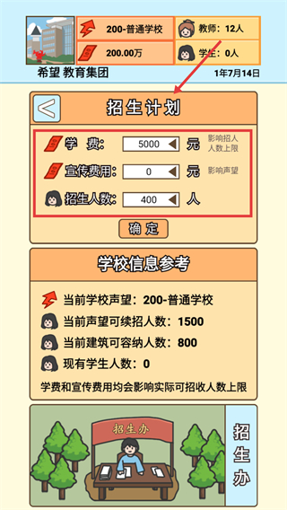 3、在【招生计划】界面设置【学费-5000元】【宣传费用-0元】【招生人数-400人】并点击【确定】执行计划。
