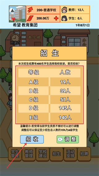 4、查看招生结果中各等级学生人数,点击【招收】按钮确认录取,补充学校生源力量,推进教学安排。