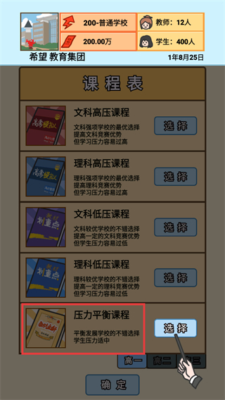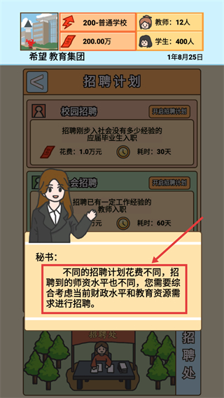 1、选择合适的学费与宣传方案,参考学生等级数据筛选生源,确定招生人数开启校董日常运营。