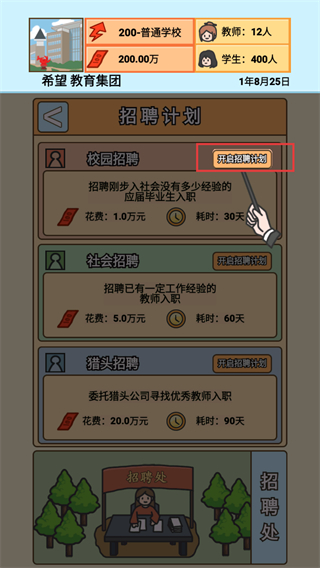 3、初期师资建设可选择【校园招聘】,点击【开启招聘计划】按钮,花费低耗时短,适合学校起步补充教师。