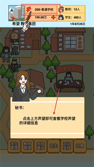 4、关注学校声望数值,点击上方声望区域查看详细信息,根据声望调整招生建设策略以提升学校等级。