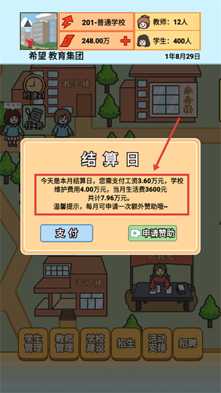 2、结算日需支付工资维护费等共【796万元】,资金不足时可选择【申请赞助】缓解压力。