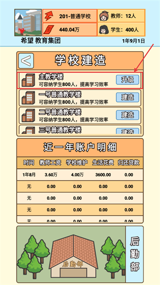3、学校建造界面中升级【主教学楼】,可容纳【800人】并提高学习效率,助力学校发展。
