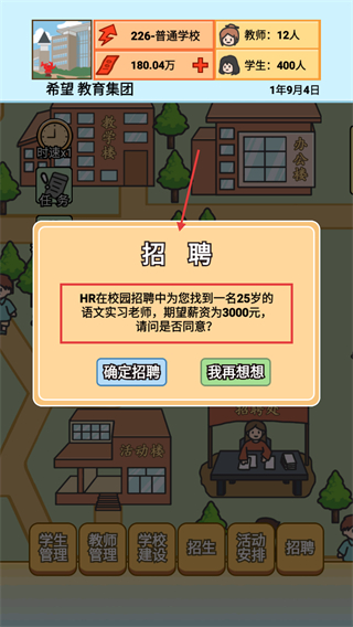 校长模拟器内置作弊菜单是一款校园题材模拟经营的游戏。接手父亲重金投资的校园,直面从零开始的经营挑战,核心目标是逐步搭建功能完善的教学设施,最终打造出一流校园。为此需依次搭建教学楼、办公楼等功能建筑,同步推进招生计划、招聘师资团队,并通过多样推广提升知名度,逐步完善校园运营体系。更值得关注的是,可自由命名教育集团,借助轻量化的文字互动机制,让经营过程兼具策略深度与轻松氛围,带来差异化的校园建设体验。