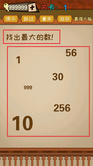 2、在“找出最大的数”关卡中,观察界面内的【1】【56】【999】等数字,需明确任务要找的“最大”对应的判定维度。