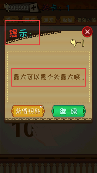 3、点击【提示】按钮获取线索,得知“最大可以是个头最大哦”,随后点击【继续】按钮,回到关卡继续完成任务。