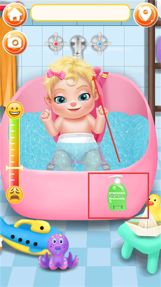 1、进入该照料环节,点击界面内的【shampoo】物品,为澡盆中的宝宝打上泡泡,同时留意左侧情绪状态条以维持良好状态。
