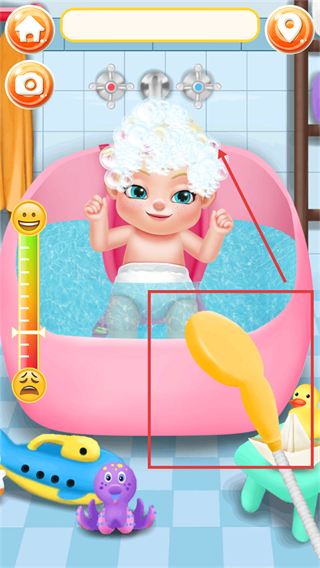 2、待宝宝头上出现泡泡后,点击界面里的黄色花洒,用其冲洗宝宝头上的泡泡,保持左侧情绪状态条的笑脸显示。