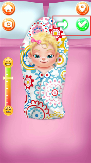 4、选定襁褓图案后,点击界面右上角的绿色对勾按钮,确认该样式选择,顺利完成这一阶段的宝宝照料任务。