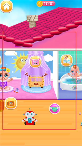 1、进入该界面后点击对应功能图标如婴儿床或洗澡模块开启照料任务,当前界面显示【1000】金币,可依托其开展后续物品使用。