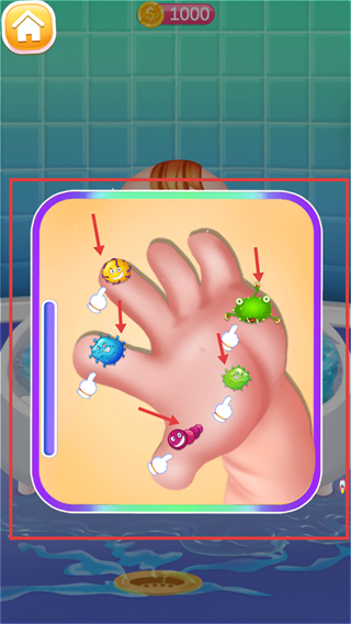 2、面对界面中手上的各类病菌,按指引点击这些病菌完成清洁操作,清理后可推进宝宝照料的后续流程。