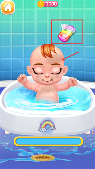 3、在宝宝洗澡环节点击界面右上角的【肥皂】,将其作用于澡盆中的宝宝,完成该步骤的照料操作。