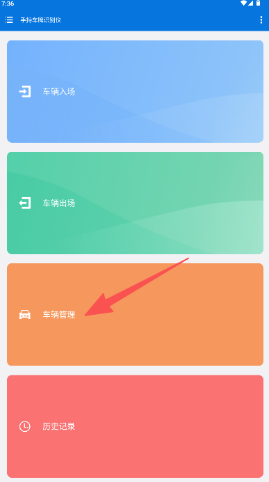 1、在首页点击“车辆管理”按钮进入车牌管理界面。