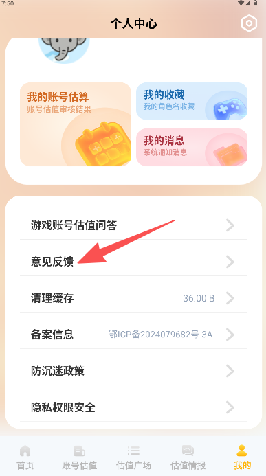 2、打开布克游进入个人中心点击“意见反馈”入口。