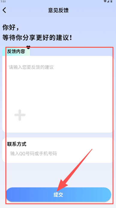 3、详细描述问题建议并填写联系方式点击提交完成反馈。
