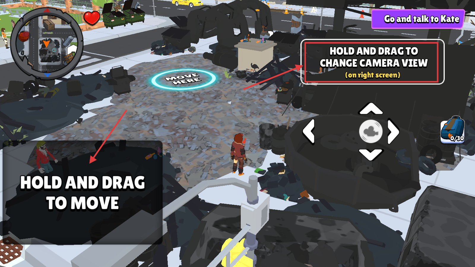 1、长按拖动左侧区域移动角色,右侧区域调整视角,按指引前往与【Kate】对话。