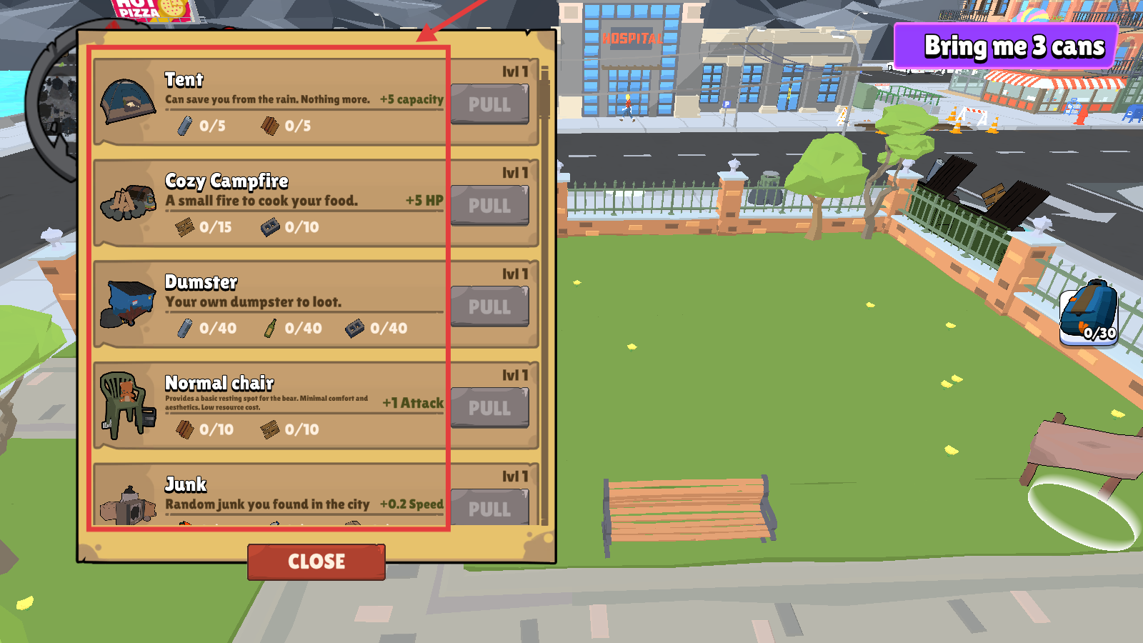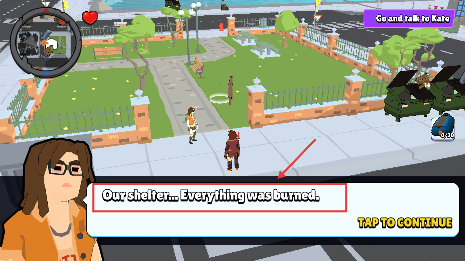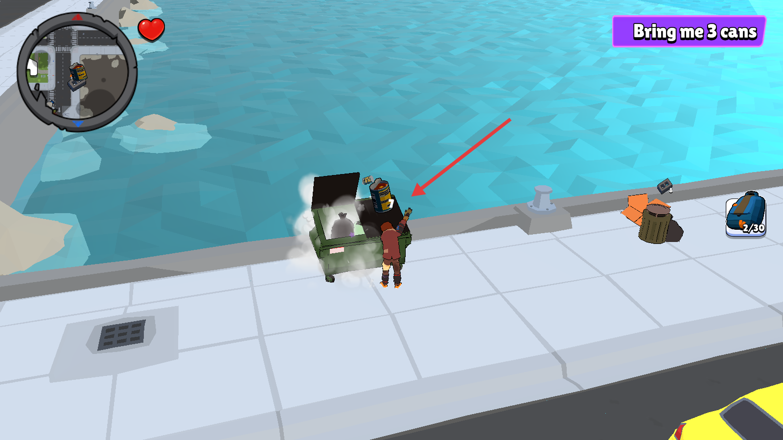 4、前往垃圾桶翻找物品,按任务收集【3-cans】,提升背包后继续探索。