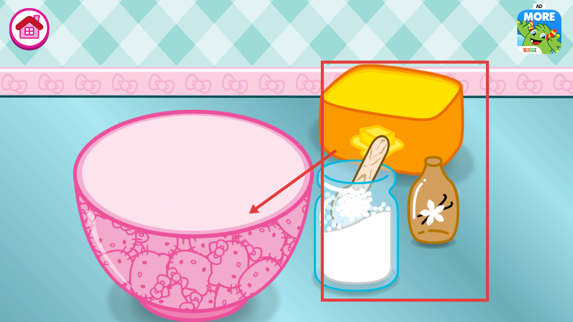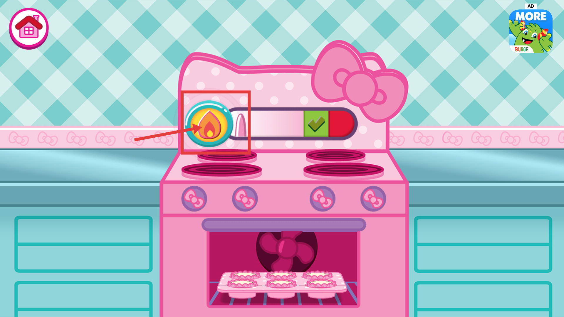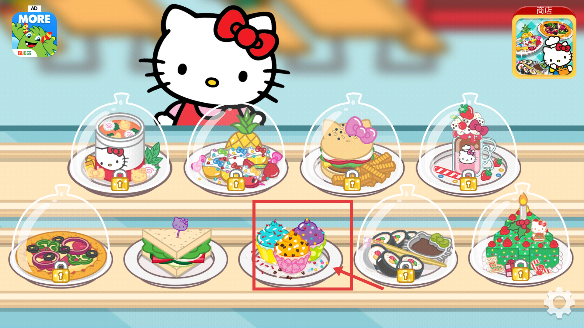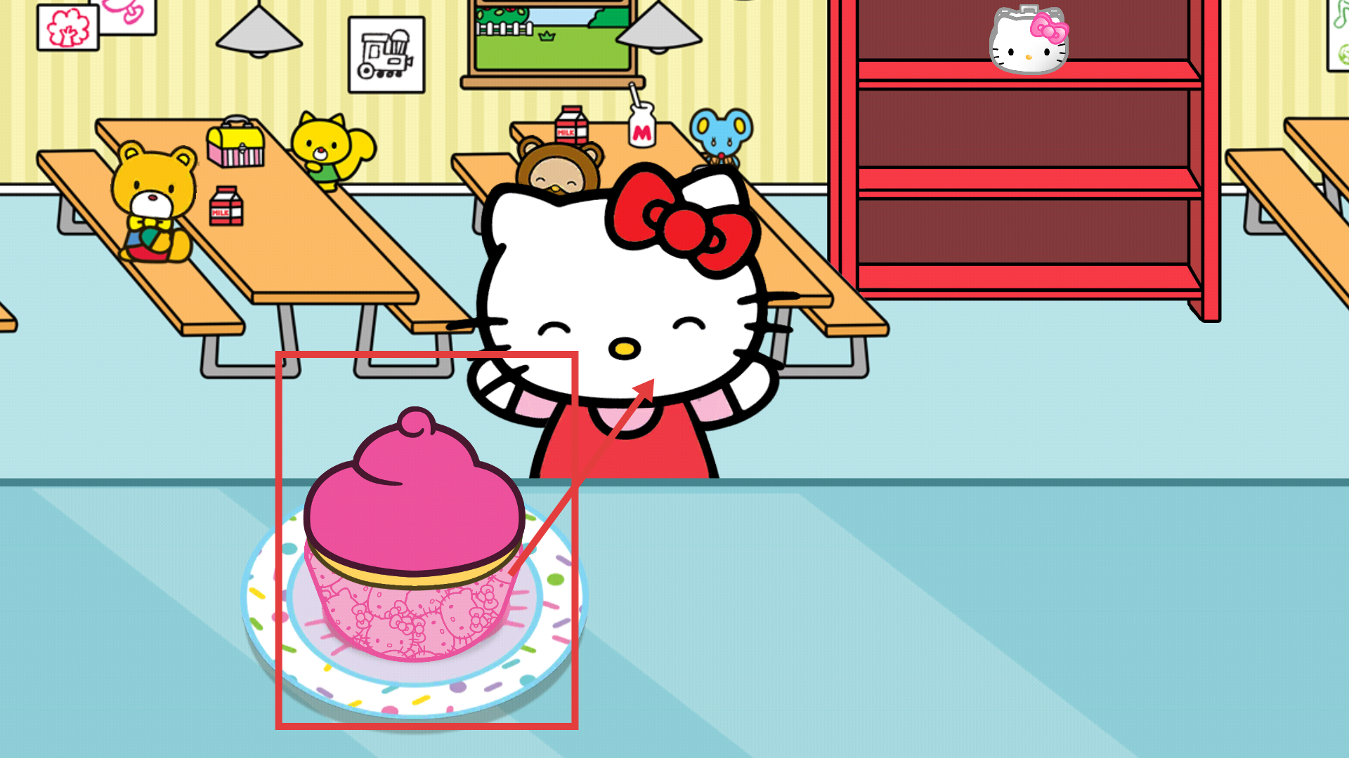 4、烤制完成后获得装饰好的纸杯蛋糕,Hello-Kitty会呈现满意反馈,代表该餐食制作关卡顺利完成。