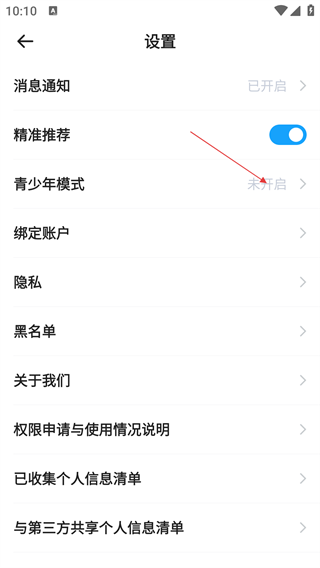 3、在设置页,点击【青少年模式】选项,进入青少年模式说明页面。