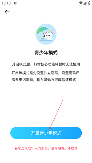 4、在青少年模式页,点击【开启青少年模式】按钮,按提示设置独立密码后即可启用。