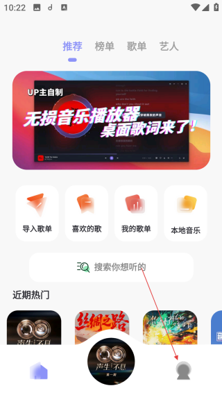 1、在音乐应用首页,点击【右下角按钮】,进入个人中心的功能设置界面。