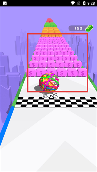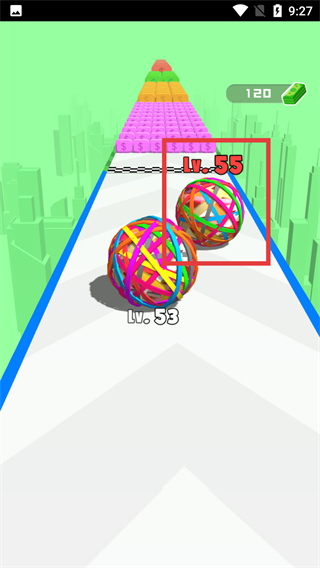2、控制橡胶球撞击红框内的橡皮筋道具,提升自身等级,推进赛道上的成长进度。