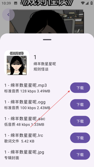 3、在音频详情页,点击【下载按钮】,弹出该音频的格式选择下载菜单。