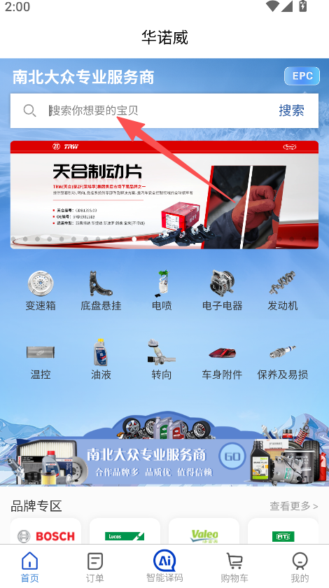 1、提供配件搜索功能,进入首页使用搜索栏,查找对应的目标汽车配件。