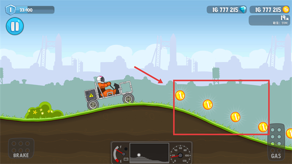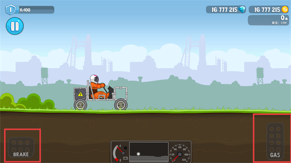 2、驾驶载具时,用【GAS】按钮加速、【BRAKE】按钮制动,留意仪表盘的状态,控制载具在地形上平稳前进。
