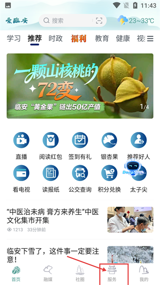 1、进入【爱临安】APP首页后,找到底部导航栏的【服务】入口点击,可查看【直播】-【阅读红包】等功能,快速进入生活服务板块。