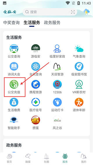 2、在【爱临安】的【服务】页面,切换到【生活服务】板块,找到并点击【公交充值】选项,进入充值操作界面。
