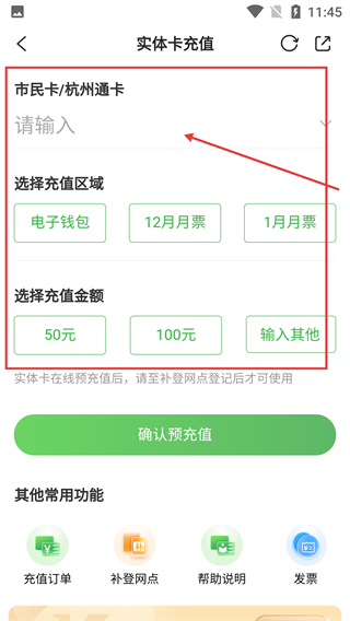 3、进入【实体卡充值】页面后,先在【市民卡/杭州通卡】输入框填卡号,再选【充值区域】和【充值金额】,准备预充值操作。