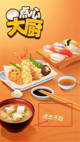 1、在【点心大厨】界面中,点击被框选的【点击开始】按钮,即可进入游戏的经营关卡,开启点心制作与服务流程。