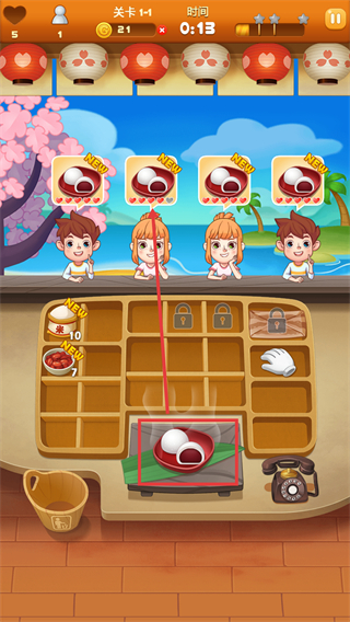 3、关卡1中,将被框选的点心放置到对应餐位,匹配顾客需求,在限时内完成服务以提升满意度。