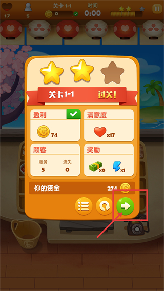 4、关卡1通关后,获取评价,点击被框选的箭头按钮,进入下一关继续挑战,积累资金与奖励。