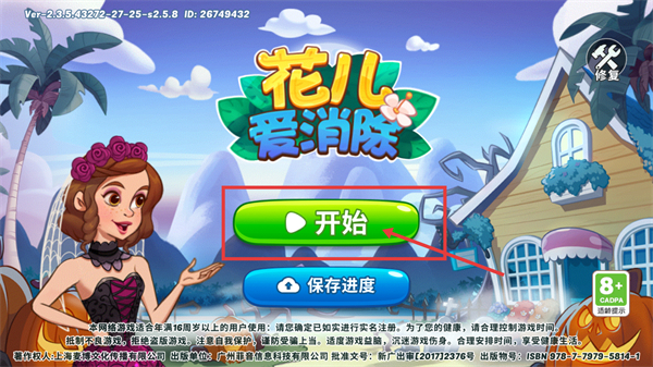 1、在【花儿爱消除】界面中,点击被框选的【开始】按钮,即可进入消除关卡,开启花朵匹配消除的挑战。