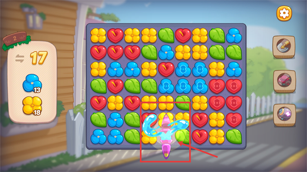 3、使用被框选的特效道具(如火箭),大范围消除同色花朵,快速推进左侧目标进度,提升关卡完成效率。